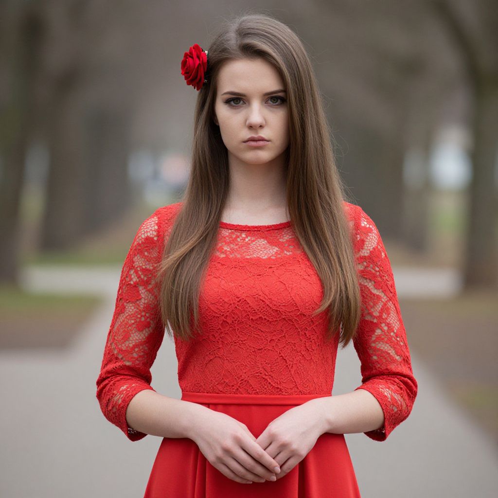 Photograph of a young Caucasian woman with long, straight brown hair, wearing a vibrant red lace dress with three-quarter sleeves. She has a serious expression and a red rose hairpin on the left side of her head. Her hands are gently clasped in front of her. The background is softly blurred, suggesting an outdoor setting with trees and a pathway. The overall vibe is elegant and slightly melancholic.