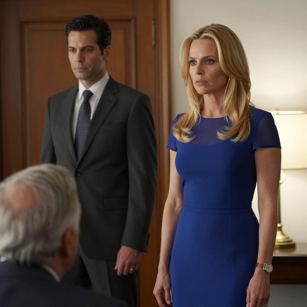 Movie still. Three people indoors. Blonde woman with blue dress and sheer top, standing with serious expression. Older man with gray hair, sitting, partially visible, looking down. Dark-haired man in suit and tie, standing, facing left, with neutral expression. Wooden door and wall in background. Soft lamp light on right.