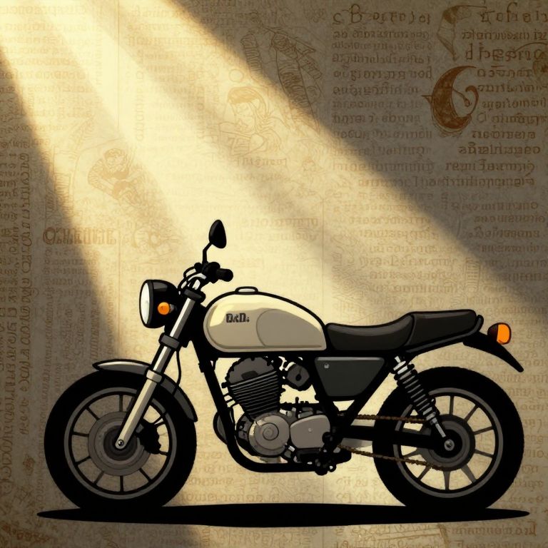 A pen-style cartoonish illustration of a motorbike illuminated by crepuscular rays, designed in the style of an illuminated manuscript and storybook illustration. The motorbike has a beige fuel tank, black seat, and black frame with detailed engine components. The background features a textured manuscript-style design with faint medieval text and drawings, enhancing the vintage and artistic feel.