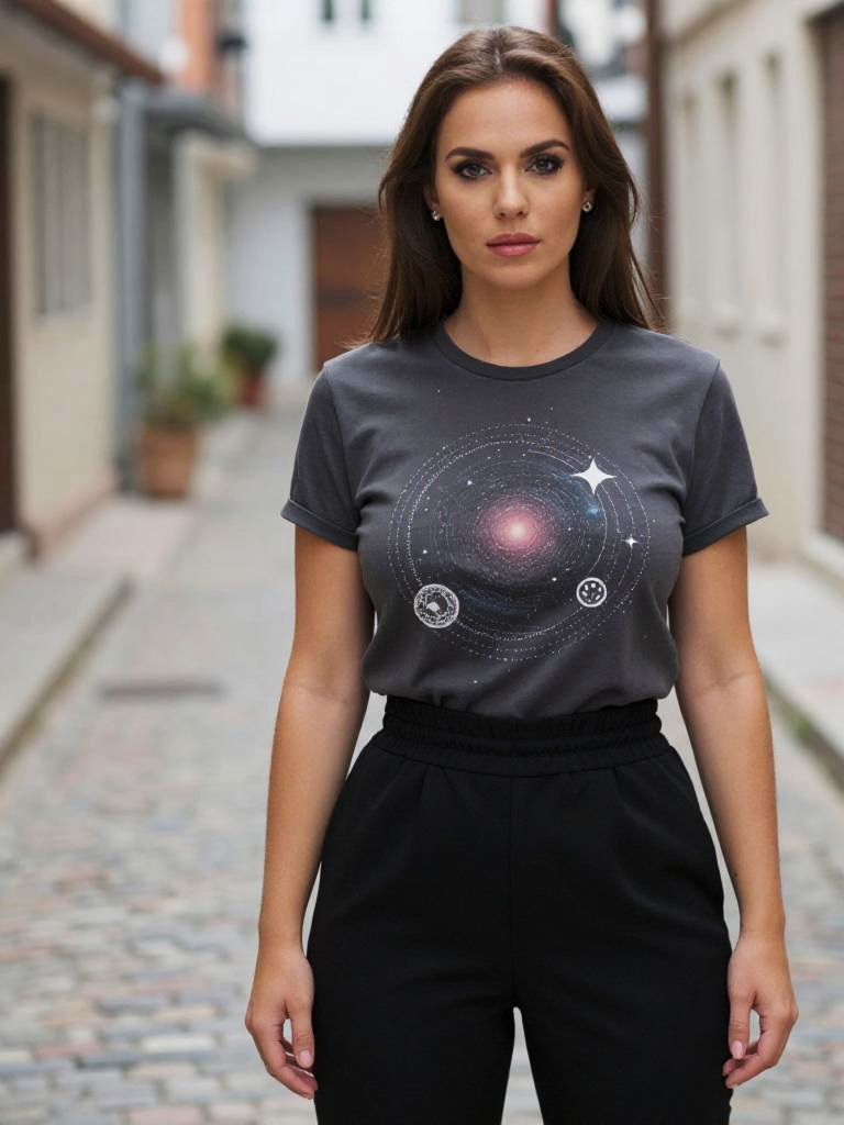 A toned woman in casual streetwear, wearing a charcoal graphic t-shirt with a celestial print tucked into relaxed-fit black trousers, standing in an alley with a cobblestone path, visual style: cinecolor. Sexy. Pretty face and beаutiful eyes. Big breasts