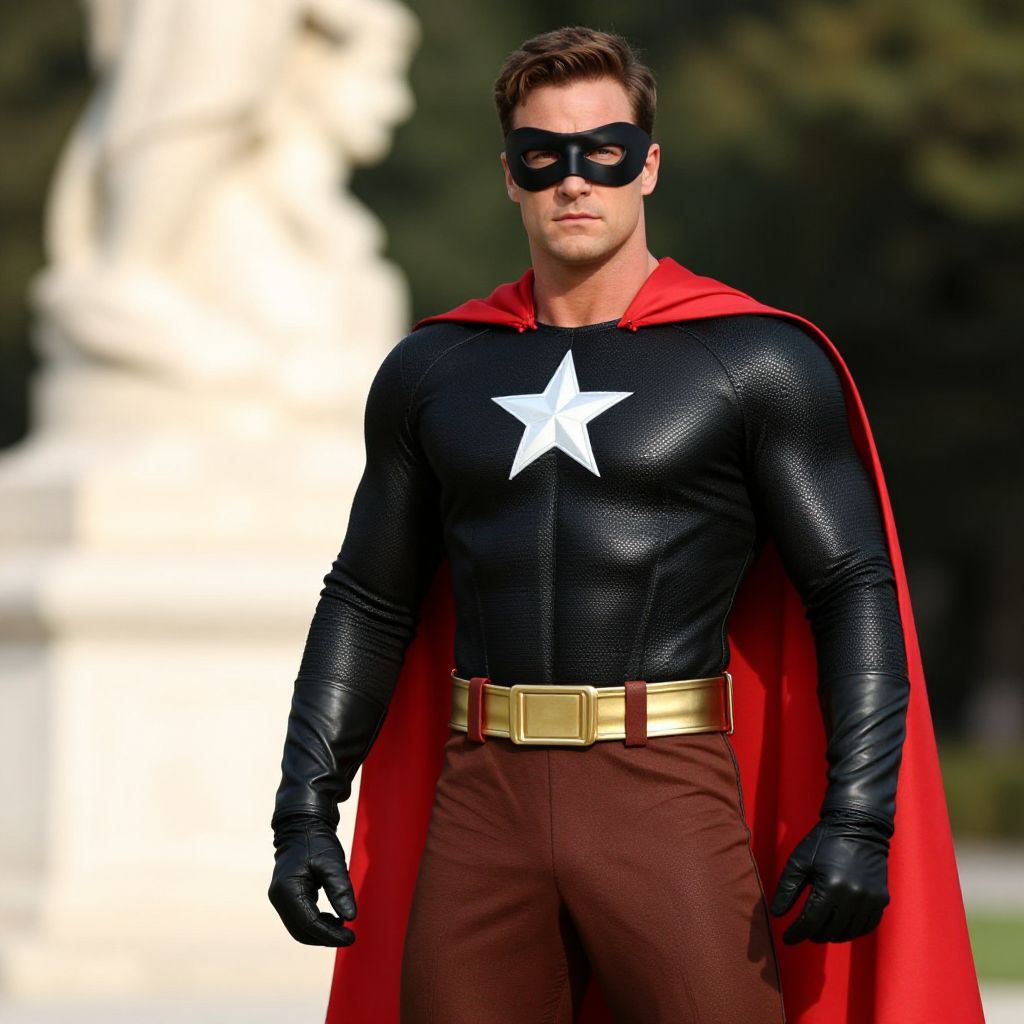 Photograph of a muscular, Caucasian man with short brown hair, dressed as a superhero. He wears a black, textured bodysuit with a large white star on the chest, black gloves, and a red cape. His outfit includes brown pants and a gold belt. He also wears a black mask covering his eyes. The background is blurred, featuring a white, stone-like structure and greenery. The lighting is bright, emphasizing his strong, defined physique. The overall style is reminiscent of classic comic book heroes.