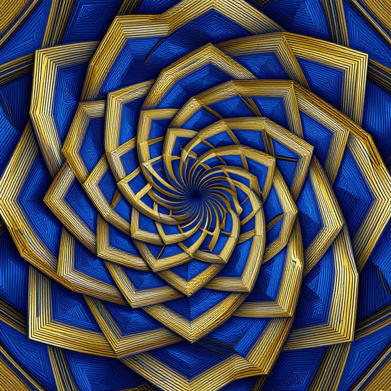 Envision an entrancing abstract geometric scene reminiscent of Op Art, showcasing intricate patterns of interlocking hexagons in vivid blue and gold tones. Viewed from an unconventional aerial viewpoint, these shapes gracefully swirl and dance around each other, generating a captivating optical illusion of depth and motion that engages the observer's gaze. This dynamic interplay of striking colors and precise geometric forms creates an emotional spectrum ranging from mesmerization to exhilaration, beckoning viewers to delve into the alluring realm of Op Art.