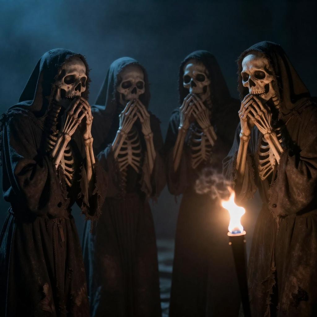 Photograph of four eerie, blue-lit, skeletal figures with grimacing faces, wearing tattered robes, standing in a dimly lit, foggy background. They hold their hands to their mouths, appearing to whisper or chant. A bright, flickering torch is in the foreground on the right, casting shadows.