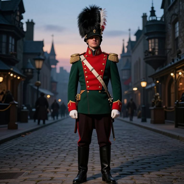 Photograph of a British soldier standing on a cobblestone street at dusk. He wears a traditional red tunic with gold epaulettes, dark green pants, black boots, and a tall, black fur hat adorned with a white plume. A brown leather strap crosses his chest. The background features an old-fashioned European town with blurred, warmly lit buildings and street lamps. The sky is a gradient of blue to pink. The soldier's expression is serious, and his white gloves contrast with the dark colors of his attire. The image has a slightly surreal, cinematic quality.