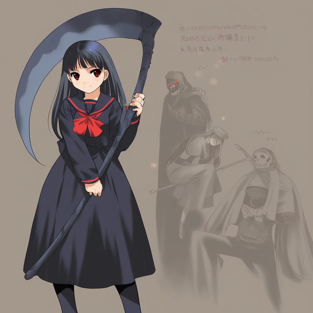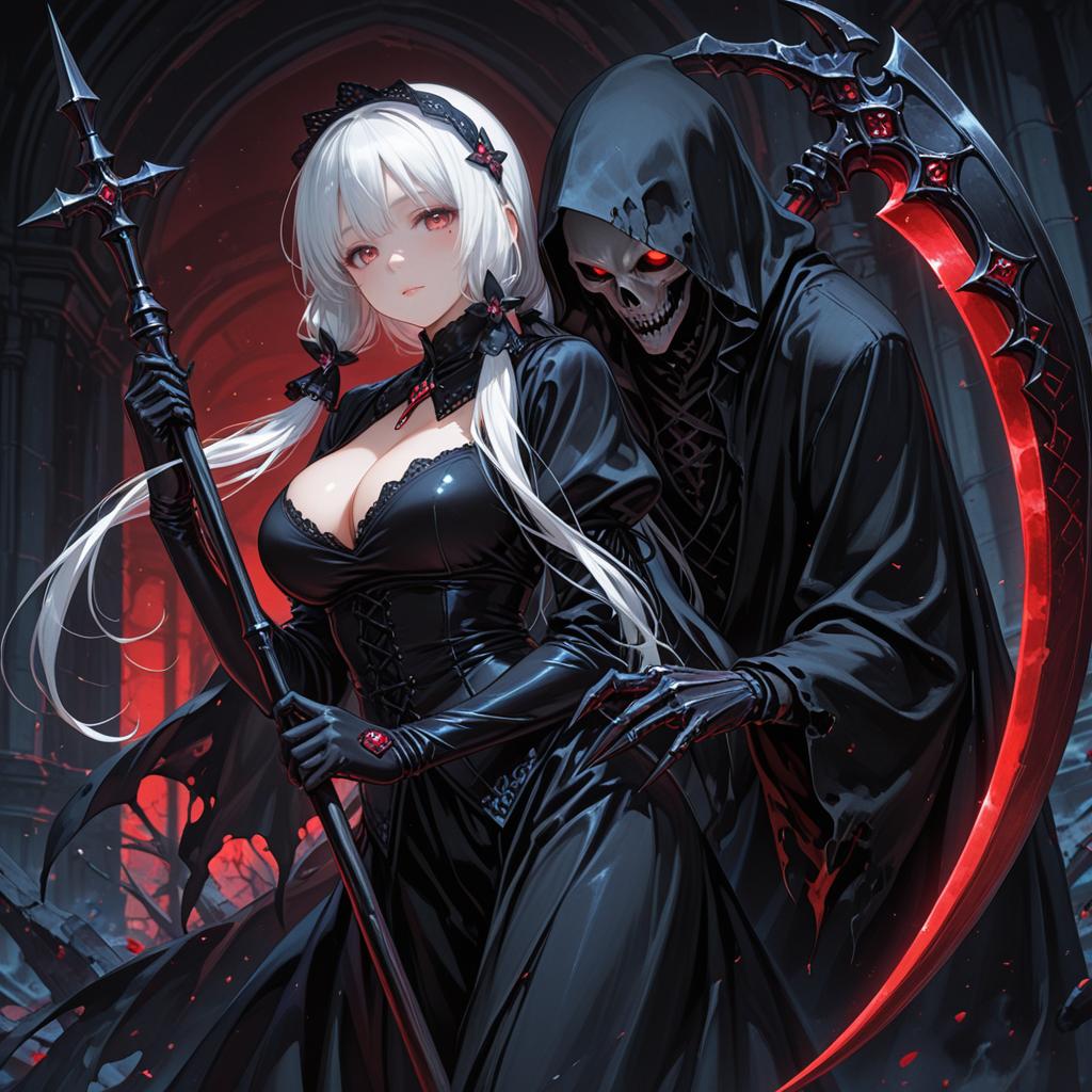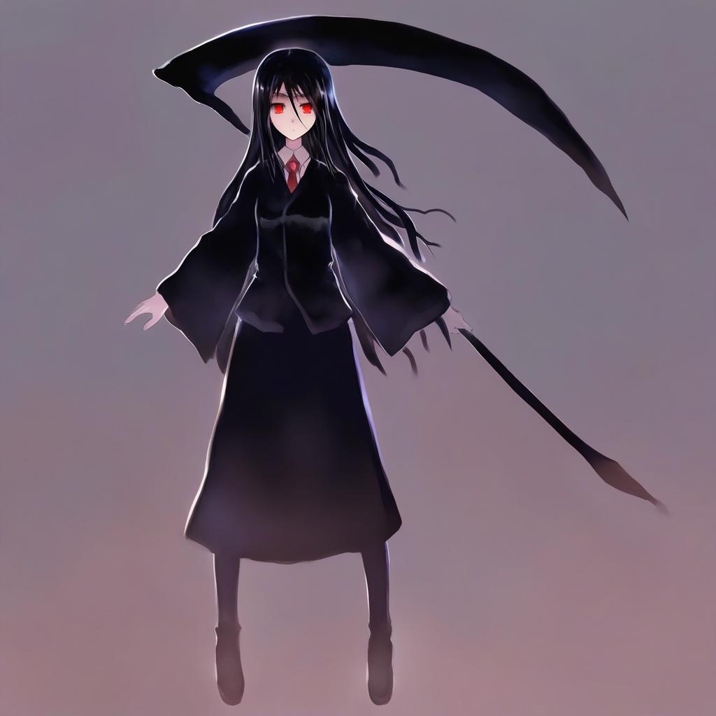 Grim reaper, original, 1girl, red eyes, long hair, scythe, by artist cafekun, leet