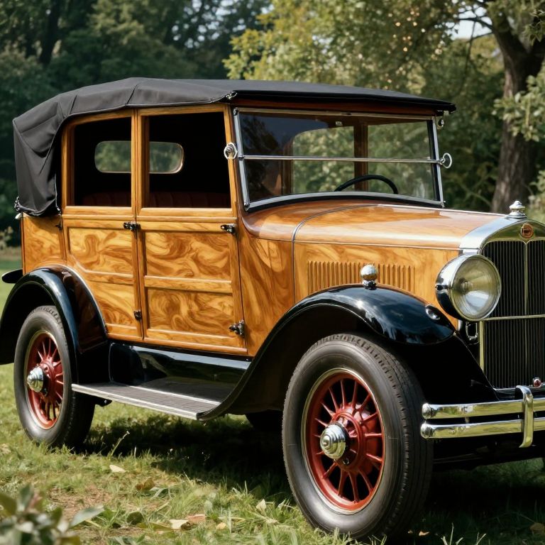Photograph of a vintage wooden-framed car with black fenders and red-spoked wheels, parked on a grassy field. The car's polished wooden body exhibits a warm, natural wood grain pattern, and it has a black fabric roof. The front features a classic grille and round headlight, with chrome accents. The background includes green trees and dappled sunlight. The car's design and detailing suggest a restored, early 20th-century model. The texture of the wood contrasts with the smooth, shiny black fenders and the rugged red wheel rims.