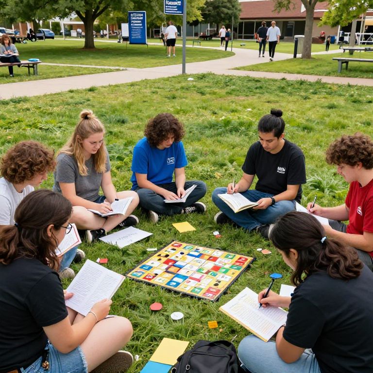 Photograph of six college students, three men and three women, sitting in a circle on a grassy campus lawn, studying or working on puzzles. They wear casual clothes, mostly T-shirts in black and blue. A colorful puzzle lies in the center, surrounded by scattered papers and pens. Background includes trees, a paved path, and distant buildings. People are seen walking in the background, and blue signs are visible. The scene is brightly lit with natural sunlight. The students' expressions are focused, and the atmosphere is studious and collaborative.