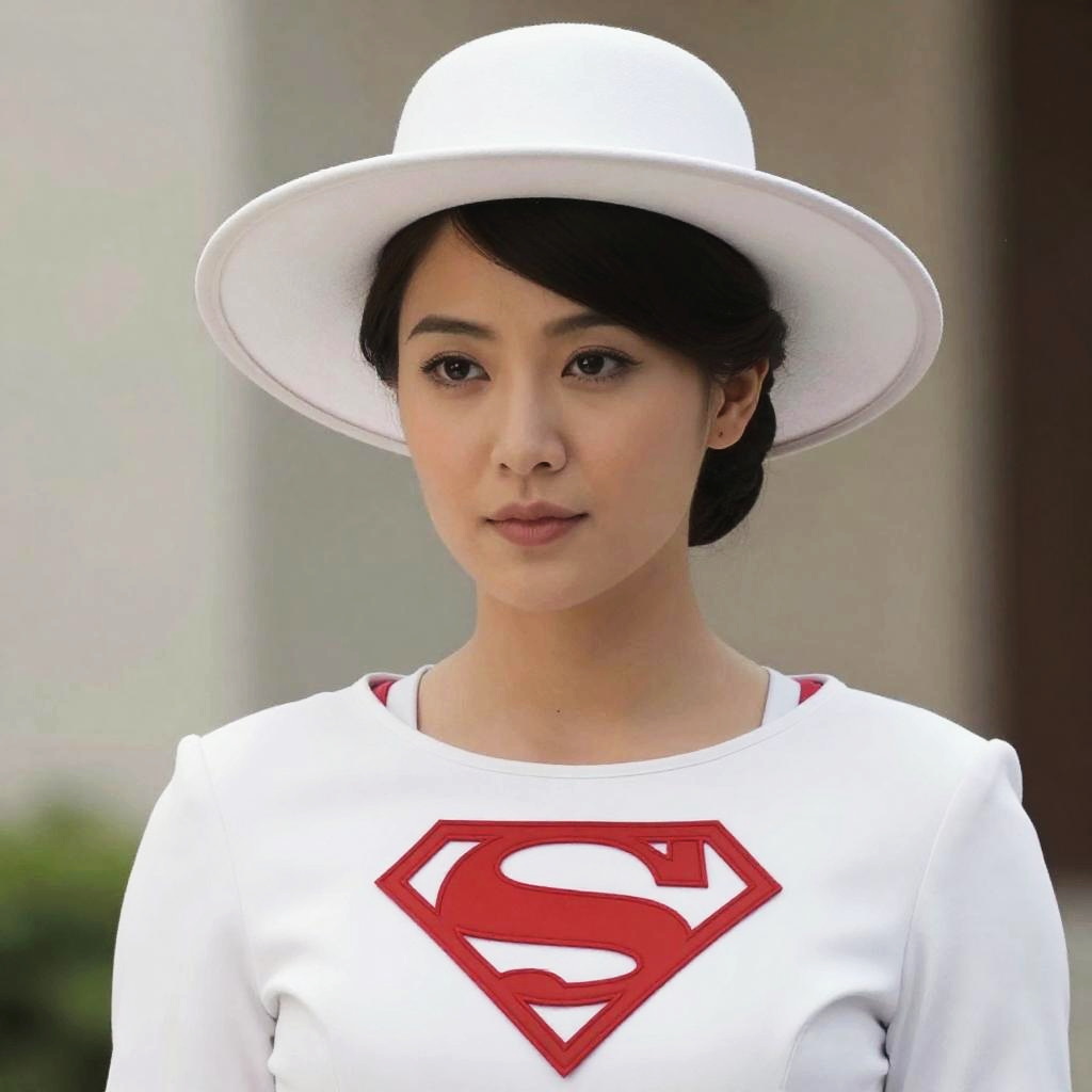 Close-up portrait of an Asian woman wearing a white Supergirl costume featuring a red 'S' emblem on the chest, paired with a stylish wide-brimmed white hat. The woman has dark hair styled neatly and wears subtle makeup.