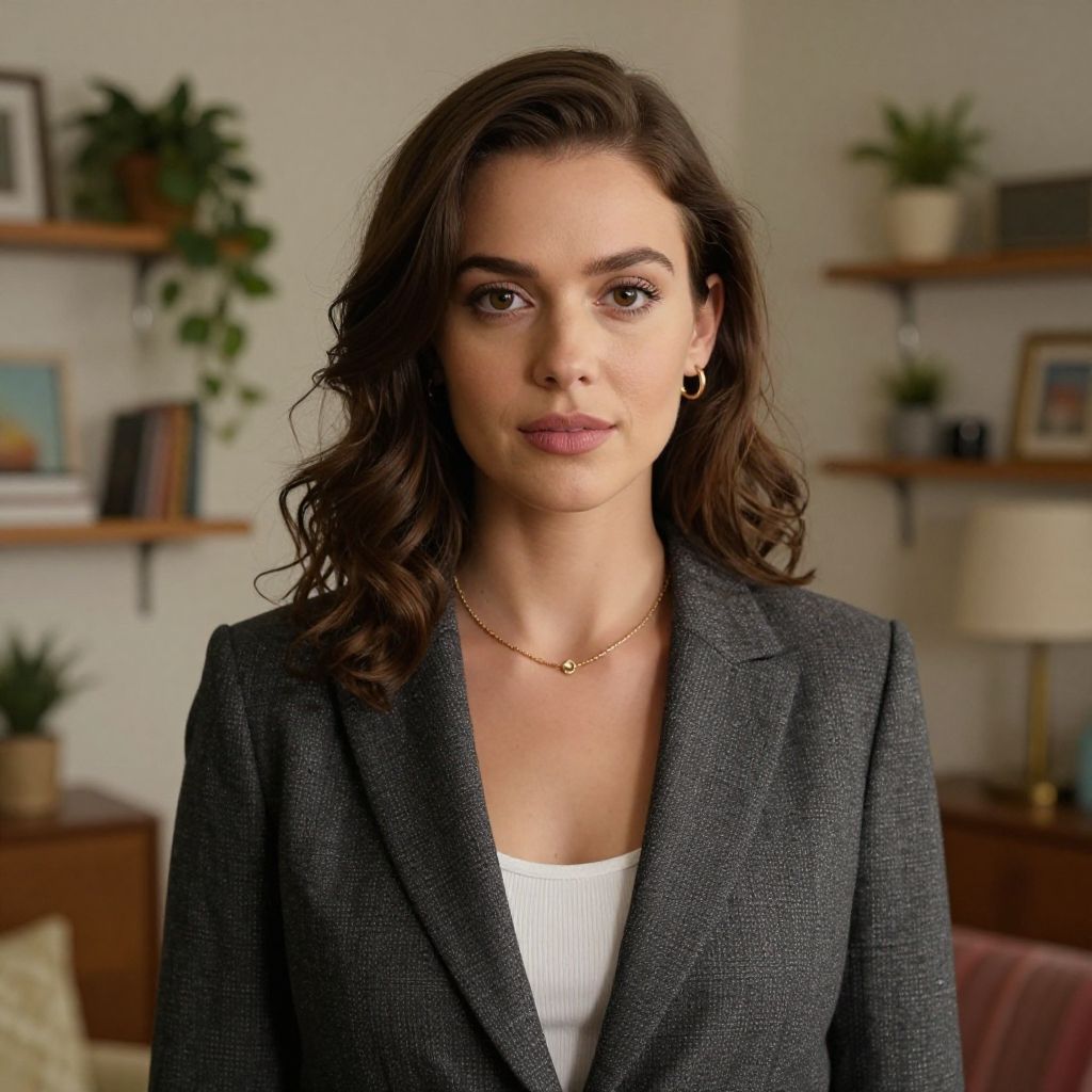 Photograph of a young woman with fair skin and dark brown, wavy hair that falls to her shoulders. She has brown eyes, arched eyebrows, and is wearing light pink lipstick. She is dressed in a dark gray, textured blazer over a white, ribbed tank top. She has small, silver hoop earrings and a delicate gold necklace with a small, heart-shaped pendant. The background features a softly lit, modern living room with white walls, wooden shelves, and green potted plants. The shelves have books and framed pictures. A beige lamp with a white shade is partially visible on the right.