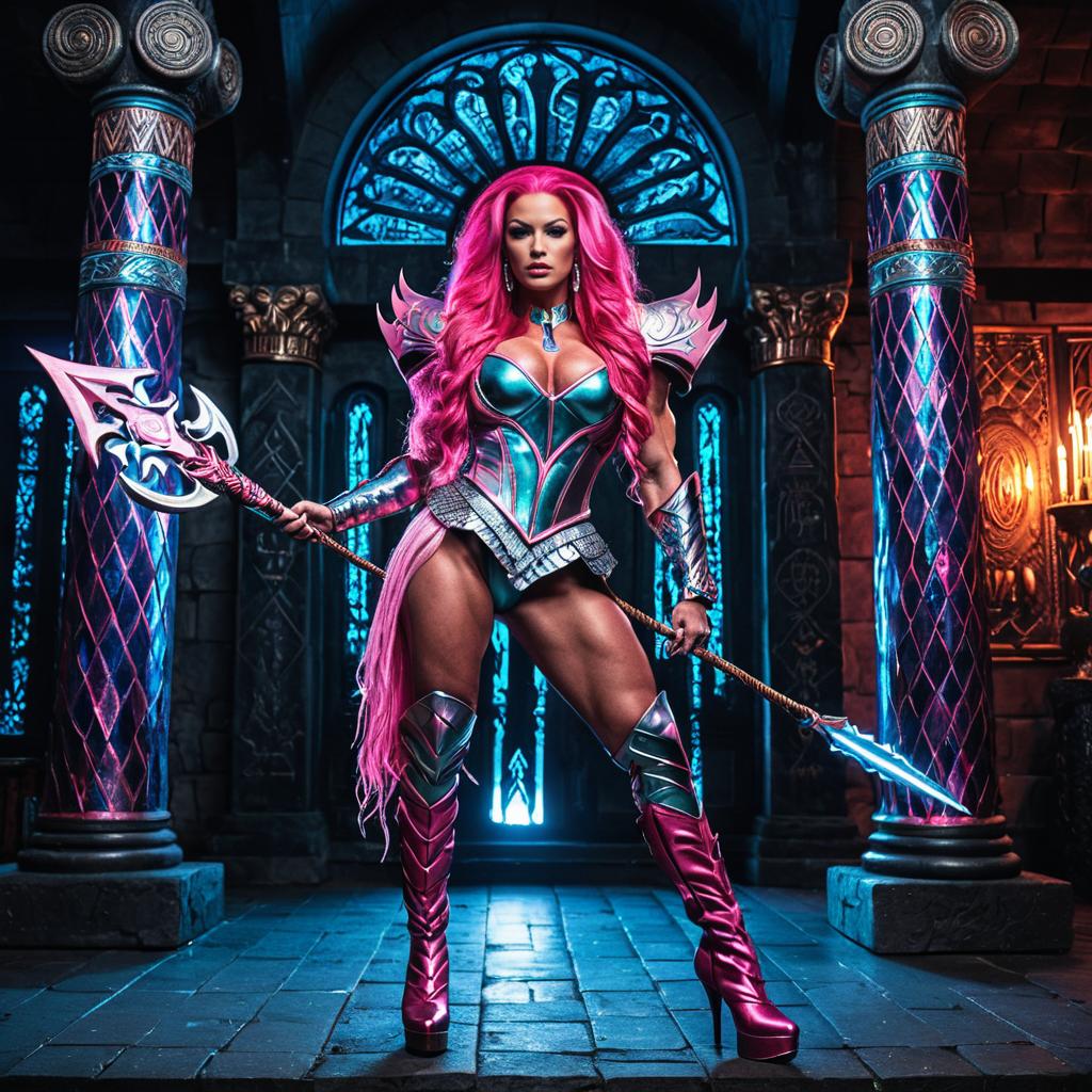 Hyper-realistic fantasy image of a gorgeous muscular 26-year-old Finnish drag queen bodybuilder with ridiculously long flowing orange hair, 7 inch high heel pumps, tight-fitting sequined outfit, posing dramatically on a stage, circus setting with colorful lights, fine details, 8k, best quality, hyper-realistic, fantasy