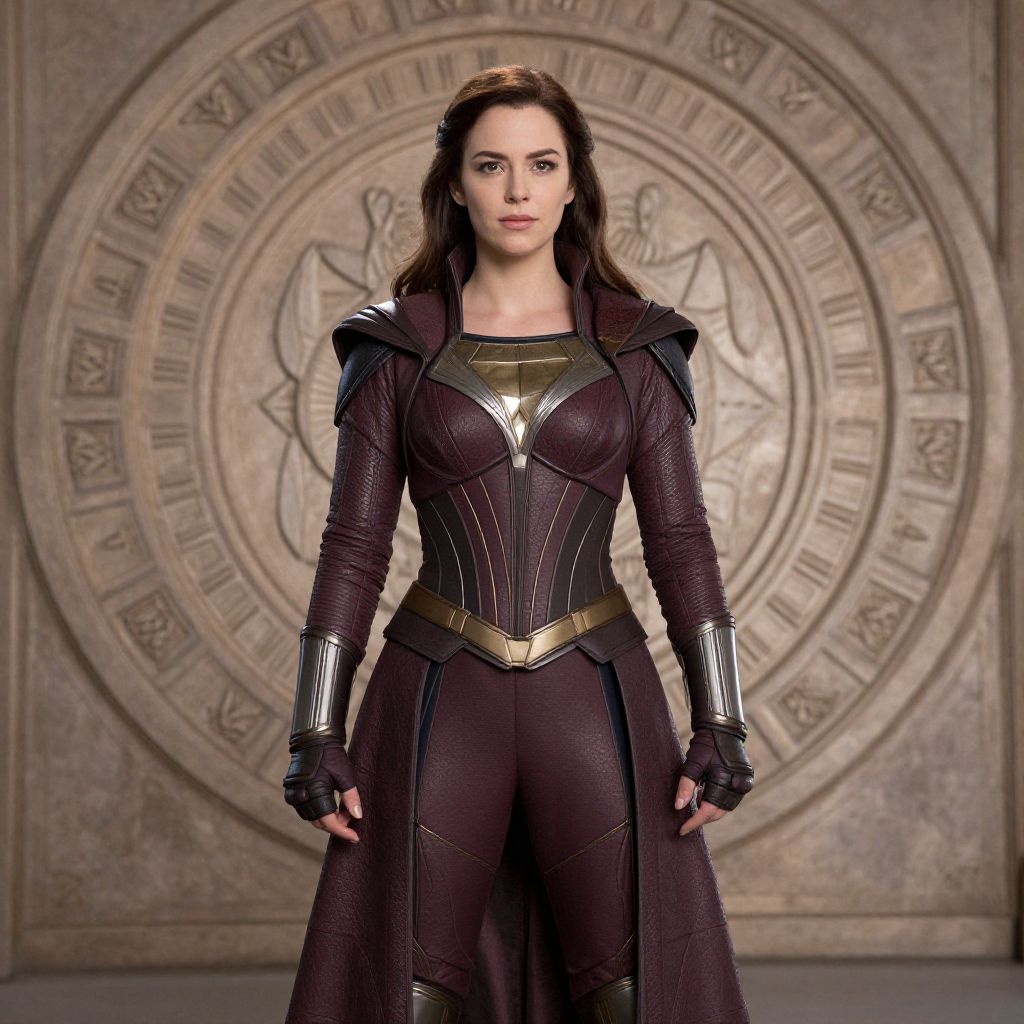 A woman dressed in an elaborate, superhero-like attire stands confidently against a detailed, circular backdrop. The costume is reminiscent of a character from a fantasy or superhero movie, featuring intricate designs and a rich, maroon color palette.
