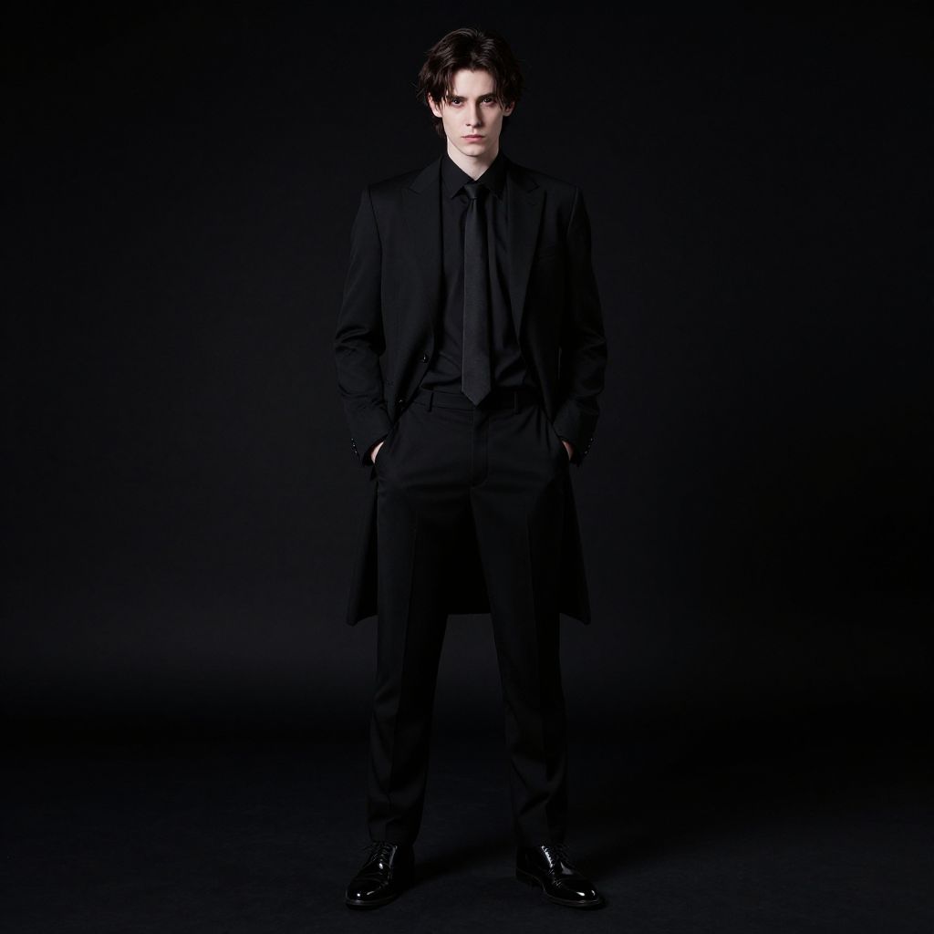Photograph of a young man with pale skin and dark brown hair, standing against a black background. He's wearing a black, long-tailed suit with a black shirt and tie, and black dress shoes. His hands are casually tucked into his suit pockets, and he's looking directly at the camera with a serious expression. The lighting is dramatic, highlighting his face and the sheen of his shoes.