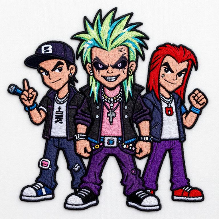 Embroidery Monogram limp Bizkit band portrait, lowbrow art, pop art, cartoon characters, cool, edgy attitude, posing for the camera, portrait,