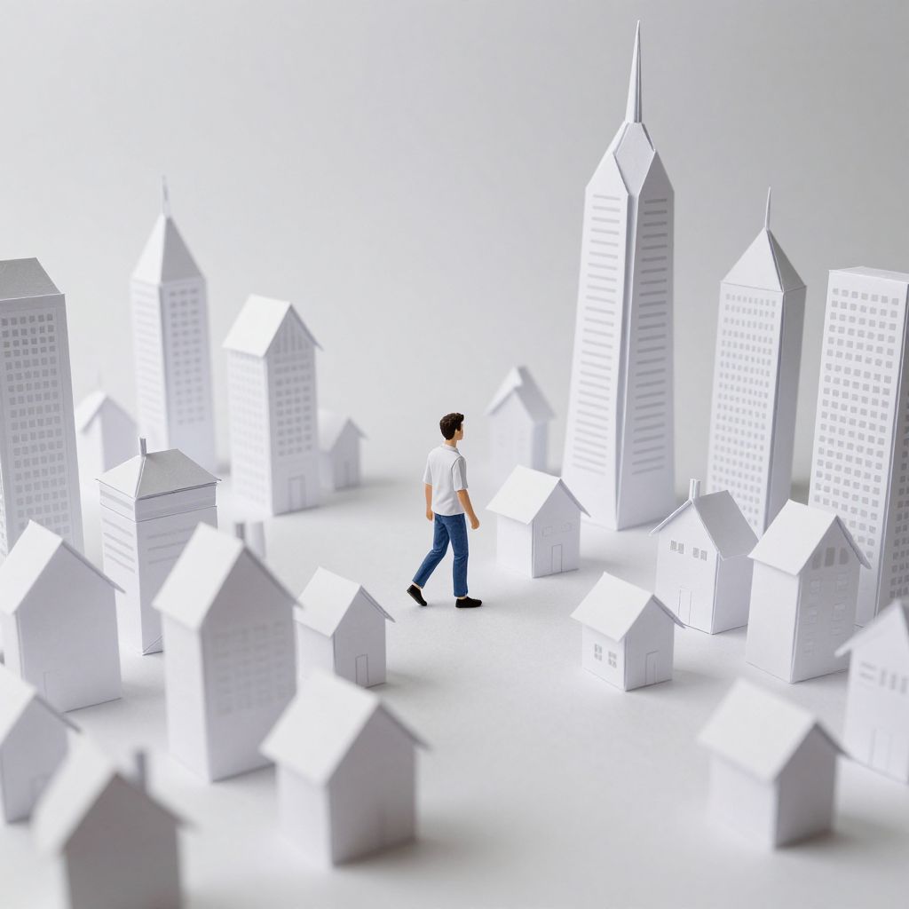A digital illustration depicts a small, solitary man with short black hair, wearing a white shirt and blue pants, walking through a futuristic, white, and minimalist cityscape. The city features numerous tall, glowing skyscrapers and smaller, glowing houses, all rendered in a sleek, white, and geometric style. The man is positioned centrally, walking towards the right, amidst the bright, luminous buildings. The background is stark white, enhancing the clean, modern aesthetic. The image conveys a sense of isolation and modernity.