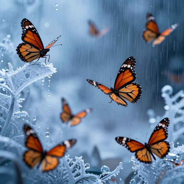 Photograph of six vibrant orange and black monarch butterflies with white spots, flying amidst icy, blue-tinted plants in a rainy setting. Raindrops are visible, creating a sparkling effect on the frosty leaves. The background is blurred, emphasizing the butterflies in the foreground. The image has a surreal, almost magical quality, with the bright orange of the butterflies contrasting sharply against the cool blue and white hues of the icy plants and rain. The scene evokes a sense of delicate beauty and tranquility.