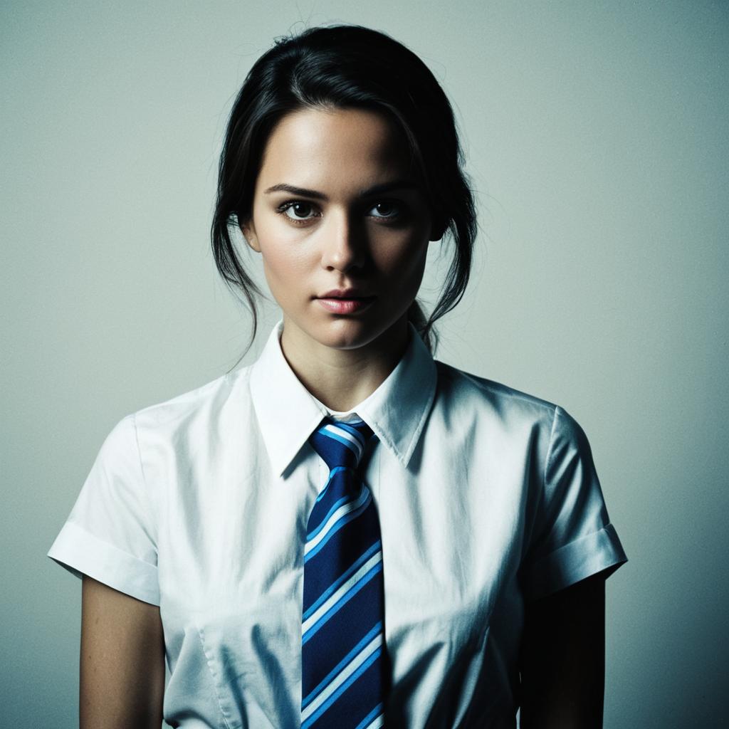 Photograph of a young woman with light skin and dark brown hair in a loose ponytail, wearing a white short-sleeve button-up shirt and a blue striped tie. Her expression is serious and slightly intense, with dark, slightly shadowed eyes. The background is a plain, gradient light gray, creating a stark contrast with her white shirt and blue tie. The lighting is cool and highlights her facial features while casting subtle shadows. The overall style is high contrast and slightly dramatic, emphasizing her serious demeanor.
