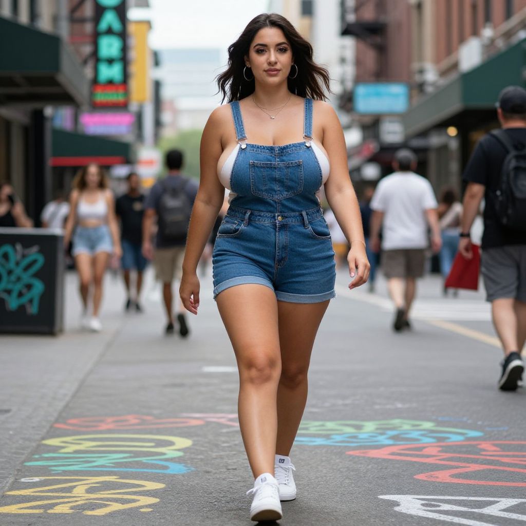 A beautiful woman with big tits and a sexy demeanor is wearing blue denim overalls and white sneakers, exuding confidence and style as she walks confidently through a vibrant urban street scene filled with colorful graffiti, bustling pedestrians, and neon signs, her posture strong and her expression bold and alluring, highlighting her radiant presence in the lively city atmosphere.