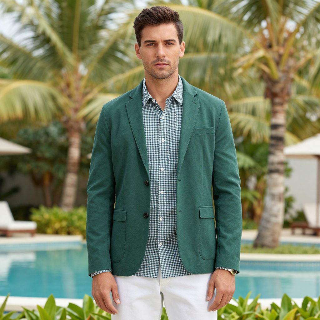 A stylish man in a casual chic ensemble featuring a green blazer and checkered shirt poses confidently in a tropical setting with palm trees and a serene pool in the background.