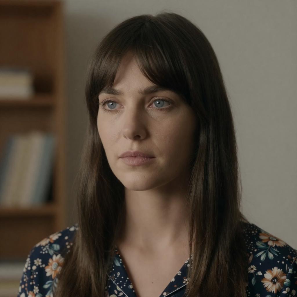 Photograph of a woman with fair skin, straight dark brown hair with bangs, blue eyes, wearing a floral-patterned shirt. She looks slightly to the left with a neutral expression. Background is blurred, focusing on her face and upper body.