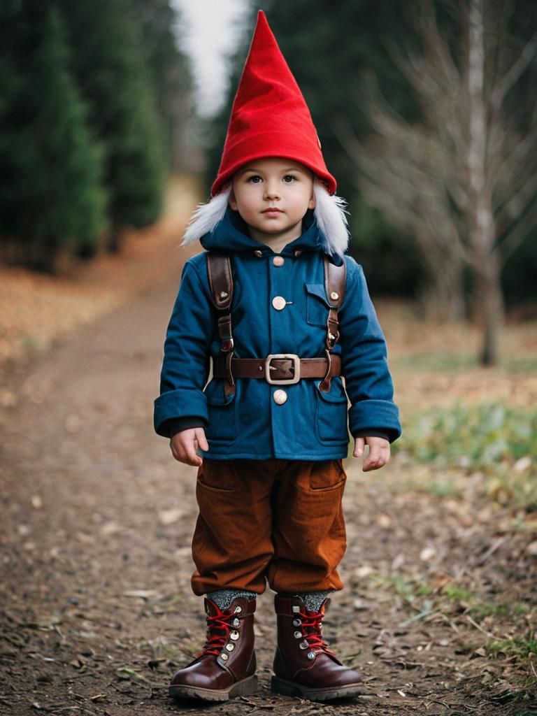 Child gnome costume, 1boy, male focus, solo, hat, boots, belt, outdoors, blurry background, red headwear, full body, standing, looking at viewer, blurry, pants, brown footwear, jacket, brown pants, brown belt