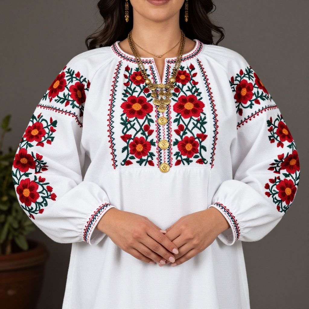 Traditional Romanian blouse featuring intricate red floral embroidery on a crisp white fabric, adorned with gold buttons and matching cuffs, worn by a woman with elegant jewelry.