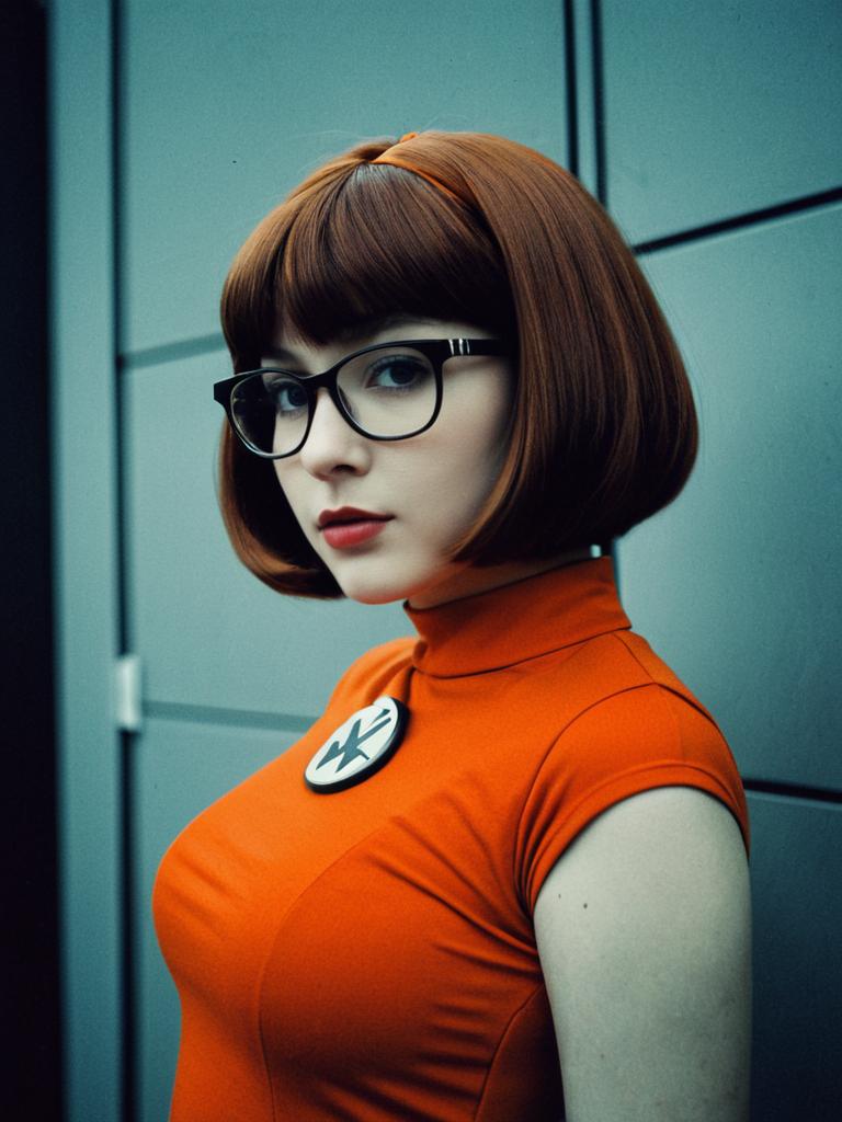 Woman in Velma Costume, waist-up editorial cosplay portrait, photorealistic tones