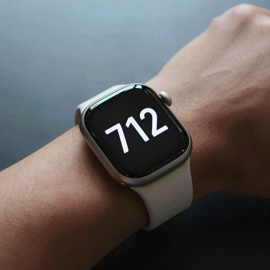 712 displayed in bold digital clock style on a sleek modern smartwatch, close-up on wrist, reflecting a minimalistic design environment with cool tones and sharp lighting, emphasizing technology and precision