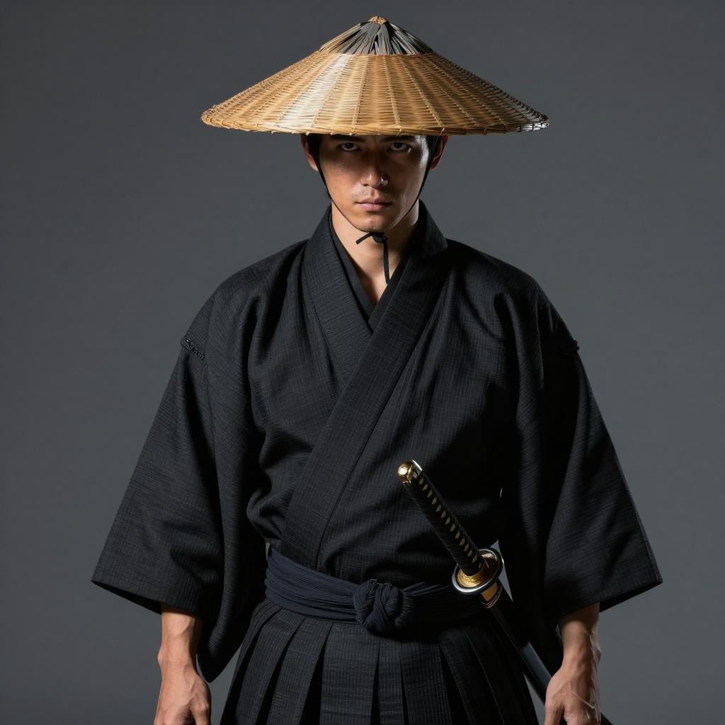 Mysterious figure in dark, feathered clothing with glowing red markings on hat and face. Wearing a conical hat with red-lit patterns, obscuring facial features. Background is dark gray. Shadowy, ured light on hat and clothing. Upper body shot. 1 person.