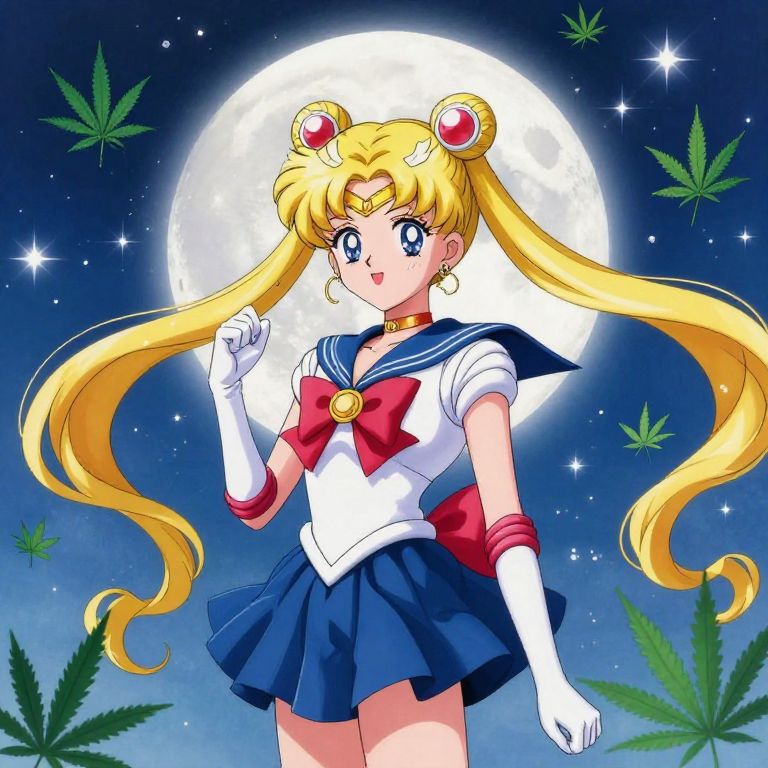 Sailor Moon weed theme, mystical night sky, anime girl in sailor suit surrounded by floating green cannabis leaves, sparkling moonlight illuminating the scene, soft pastel colors