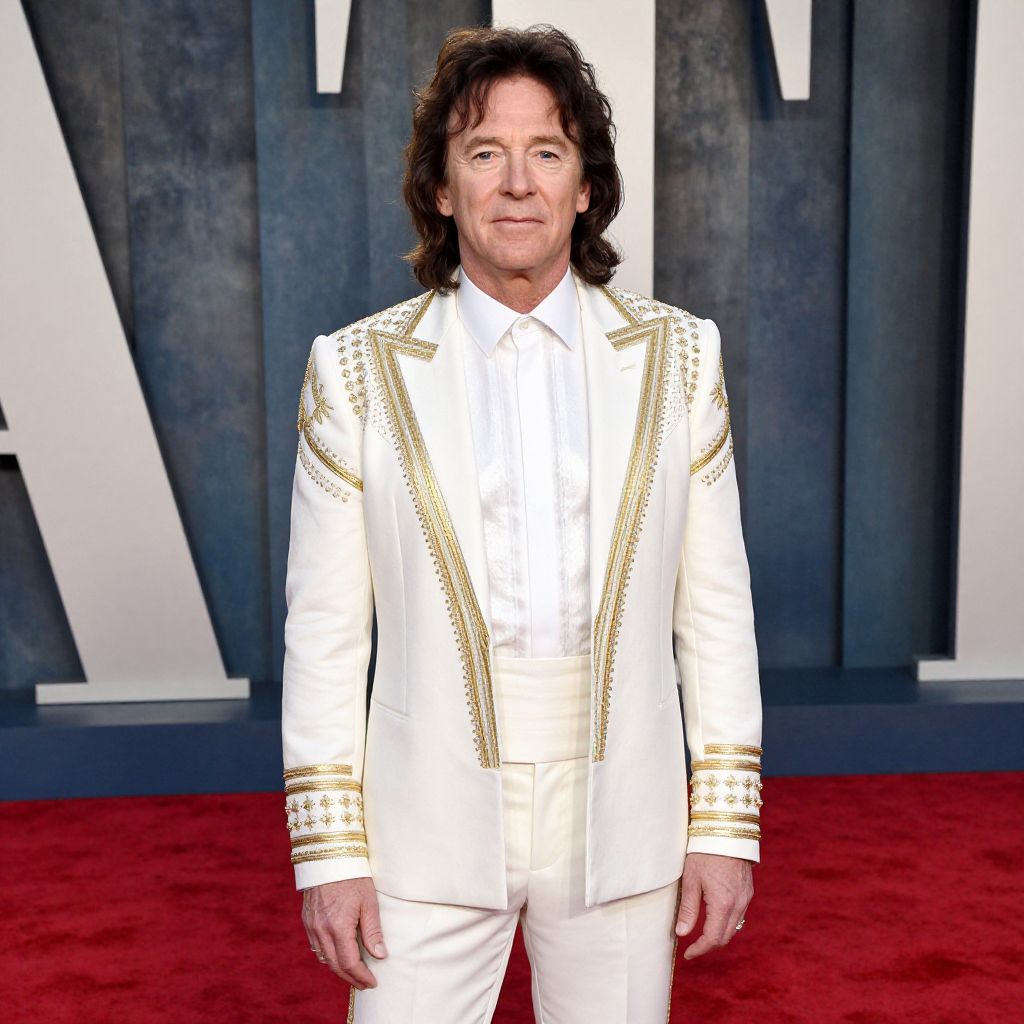 Photograph of a middle-aged man with medium-length, wavy brown hair standing on a red carpet. He wears a white suit with gold embellishments on the shoulders, chest, and cuffs, paired with a white shirt. His expression is neutral, and he stands in front of a dark, textured background with large, white, vertical letters. The red carpet contrasts with his white outfit, highlighting his formal attire. The lighting is bright, emphasizing the details of his outfit and the background.