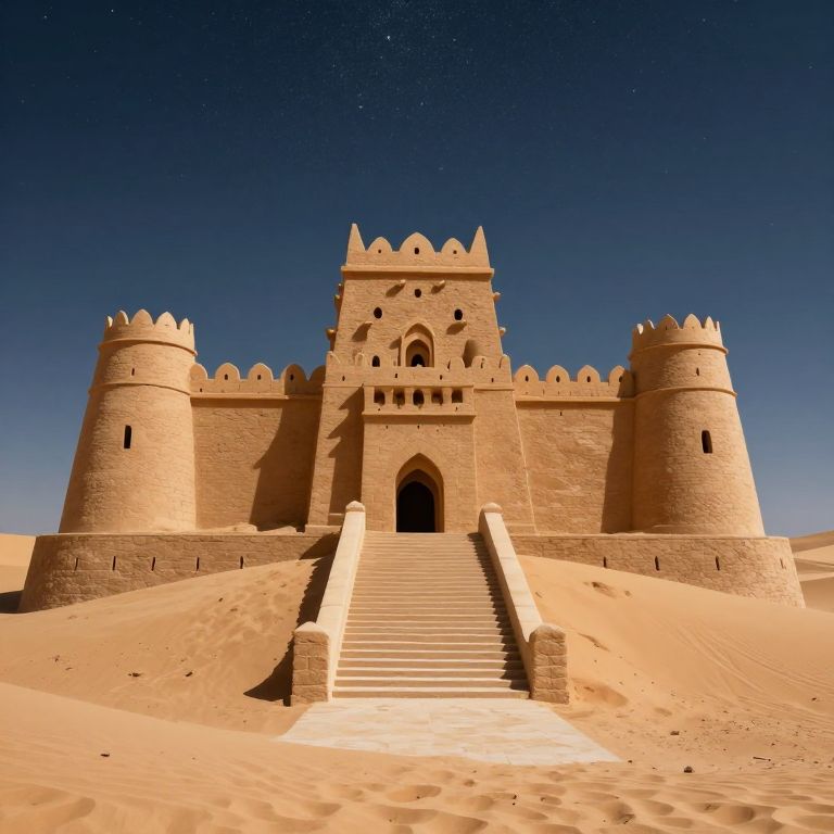 Photograph of a desert castle with two cylindrical towers, arched entrance, and stone staircase, under a clear, starry night sky.