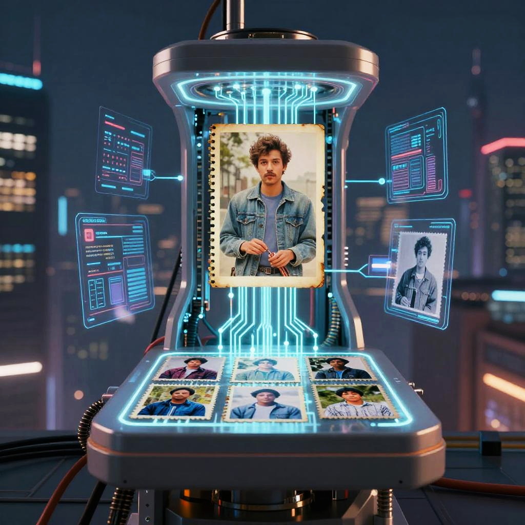 AI picture transformer depicted as a futuristic machine converting old photographs into vibrant, high-resolution artworks, glowing circuits and holographic displays surrounding the transformation process, in a cyberpunk cityscape backdrop.