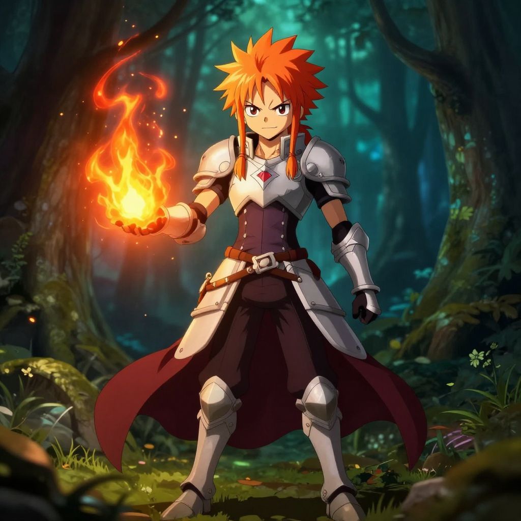 Fairy Tail OC Maker-inspired portrait showing an original mage character standing confidently in a mystical forest, casting a fire spell with swirling embers, detailed fantasy armor and vibrant hair colors, ethereal lighting, anime art style, richly textured background.