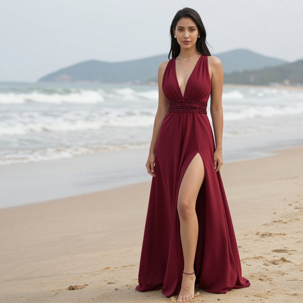 Photograph of a dark-haired woman in a deep red, sleeveless V-neck gown with a high slit, standing on a sunny beach with waves and