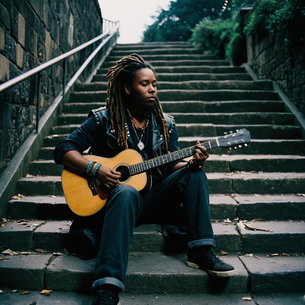 Kodak Portra cinematic film still of a street musician with dreadlocks, wearing a worn leather vest and bracelets, playing guitar on steps of an old stone staircase at twilight, moody and atmospheric vibe.