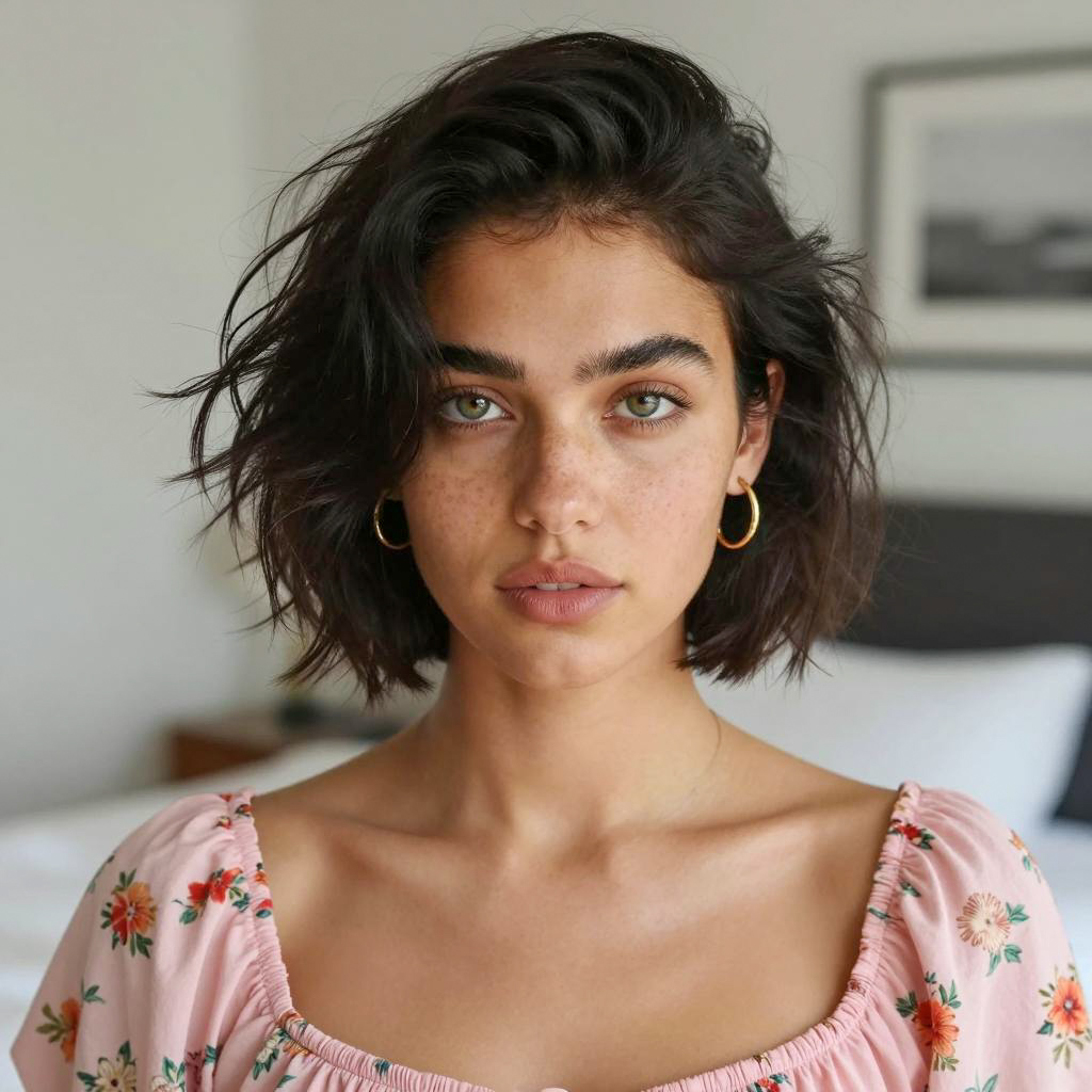 Photograph of a young woman with long, wavy dark brown hair, tan skin, and brown eyes. She wears a thin-strapped top and holds a straw hat with a blue band in front of her. Sunlight shines from behind her head. Clear blue sky background. Her expression is neutral with slightly parted lips. Her hair falls loosely over her shoulders. She is centered in the frame.