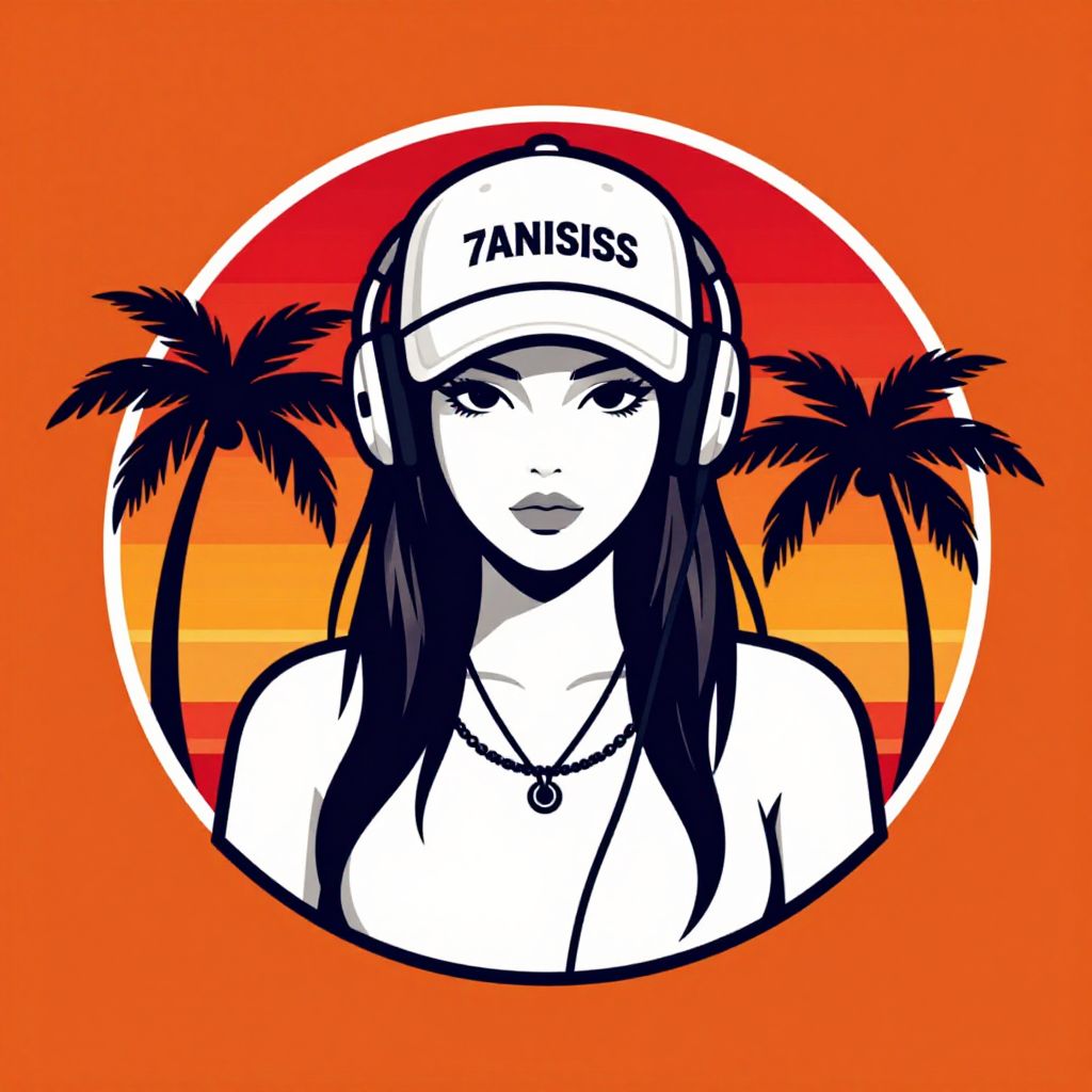 The image features a striking logo of a young woman in a minimalist, GTA San Andreas style. She is depicted with long, flowing hair, wearing a white cap with the word \"7ANISISS\" embroidered on it. The woman is accessorized with a black necklace and a pair of headphones, one of which is prominently displayed in front of her face. The background is a vibrant, circular gradient transitioning from red to orange, with silhouettes of palm trees adding to the tropical ambiance. The overall composition is balanced, with the woman centrally positioned and the elements arranged in a way that draws the viewer's eye towards her face and the details of her attire. The use of bold colors and clean lines gives the logo a dynamic and modern feel.