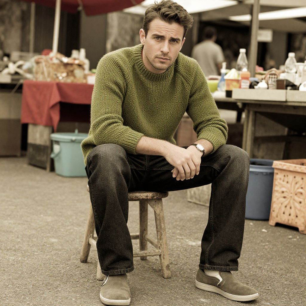 A man, cream open-knit cardigan, acid-wash torn jeans, olive green henley shirt, gray suede desert boots, simple silver bracelet, sun-drenched plaza, rustic wooden signs, eclectic mix of handmade goods, ektachrome film stock, relaxed smile, warm sunlight illuminating his features. Man has masculine face and piercing eyes
