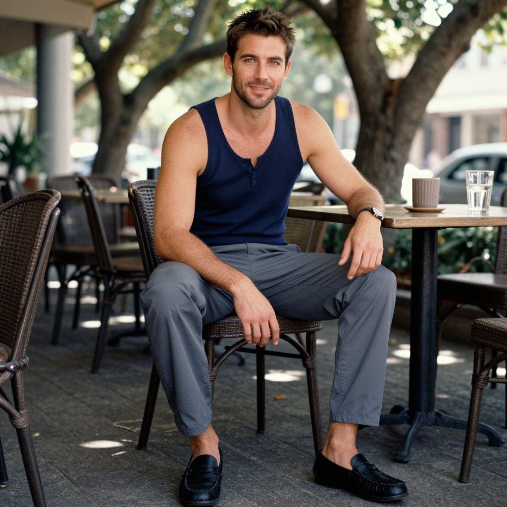Photograph of a handsome, bearded man with dark hair and light skin, sitting on a sidewalk in front of a rustic café. He wears a loose-knit, cream-colored cardigan over a green shirt, paired with distressed, light blue jeans and gray suede boots. His expression is relaxed and slightly seductive, with a subtle smile. The café has wooden signs reading "Bakery" and "Deli," and colorful tablecloths are visible in the background. Sunlight casts shadows, adding depth to the image, which has a slightly over-saturated, vibrant color style.