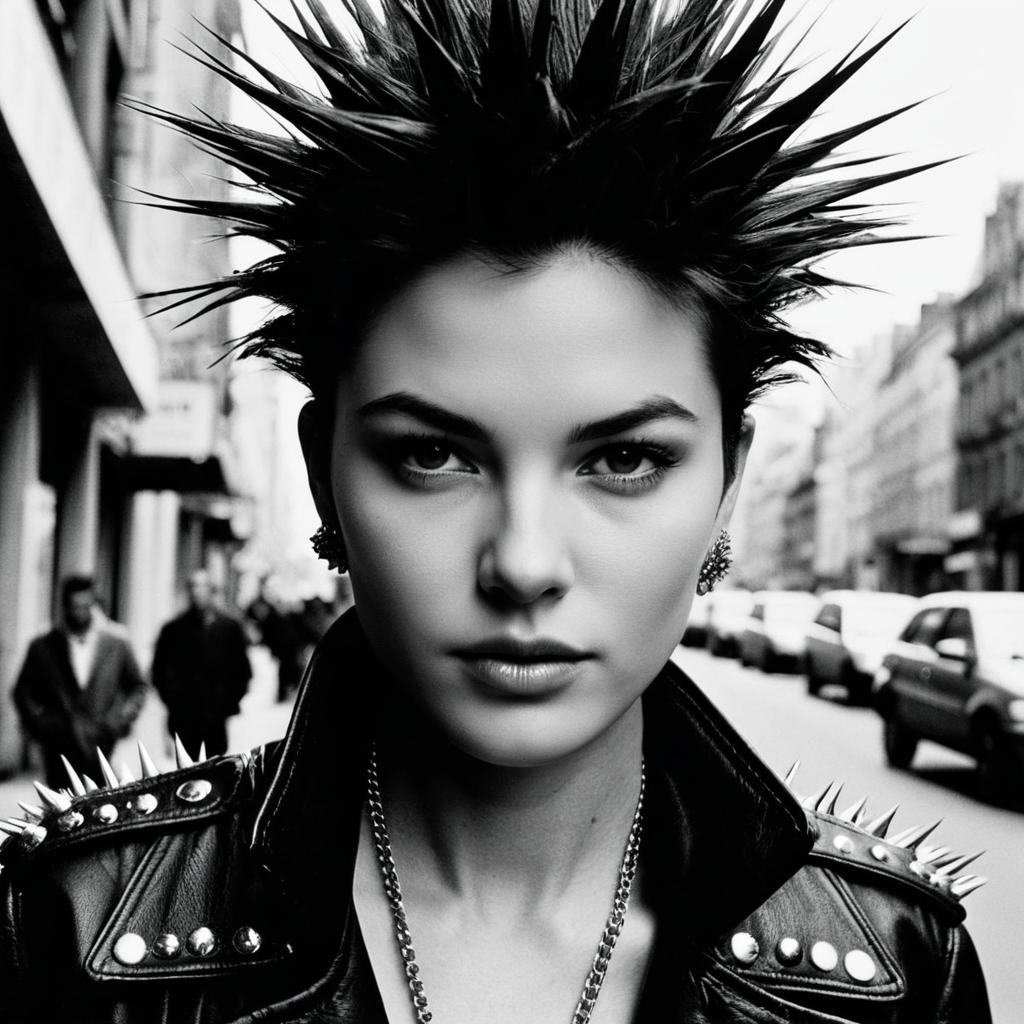 Close-up black and white portrait of a young woman with spiky hair styled in a punk fashion, wearing a studded leather jacket and chain necklace. She has piercings in her ears and intense gaze, photographed on a city street with blurred pedestrians and cars in the background. The image has a vintage analog film grain look.