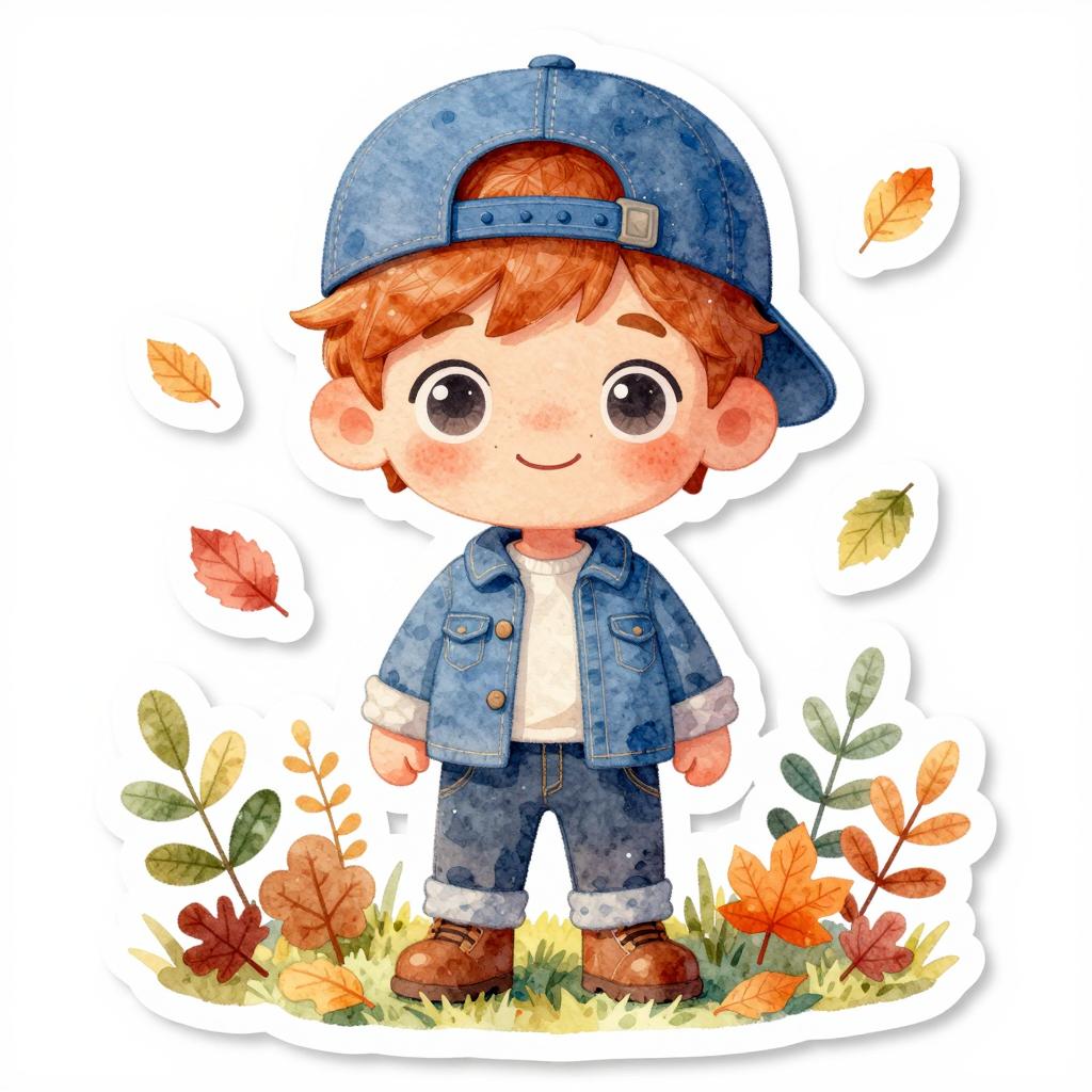 Watercolor pastel full-body sticker of young ginger-haired boy with freckles and a blue cap wearing denim jeans and boots in autumn forest clearing with colorful falling leaves, white background, transparent PNG, neon highlights, upscaled, big sparkling eyes, cute smiling face