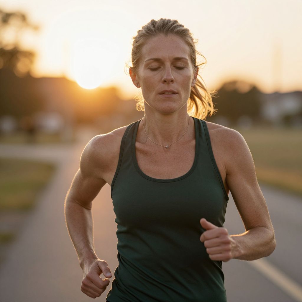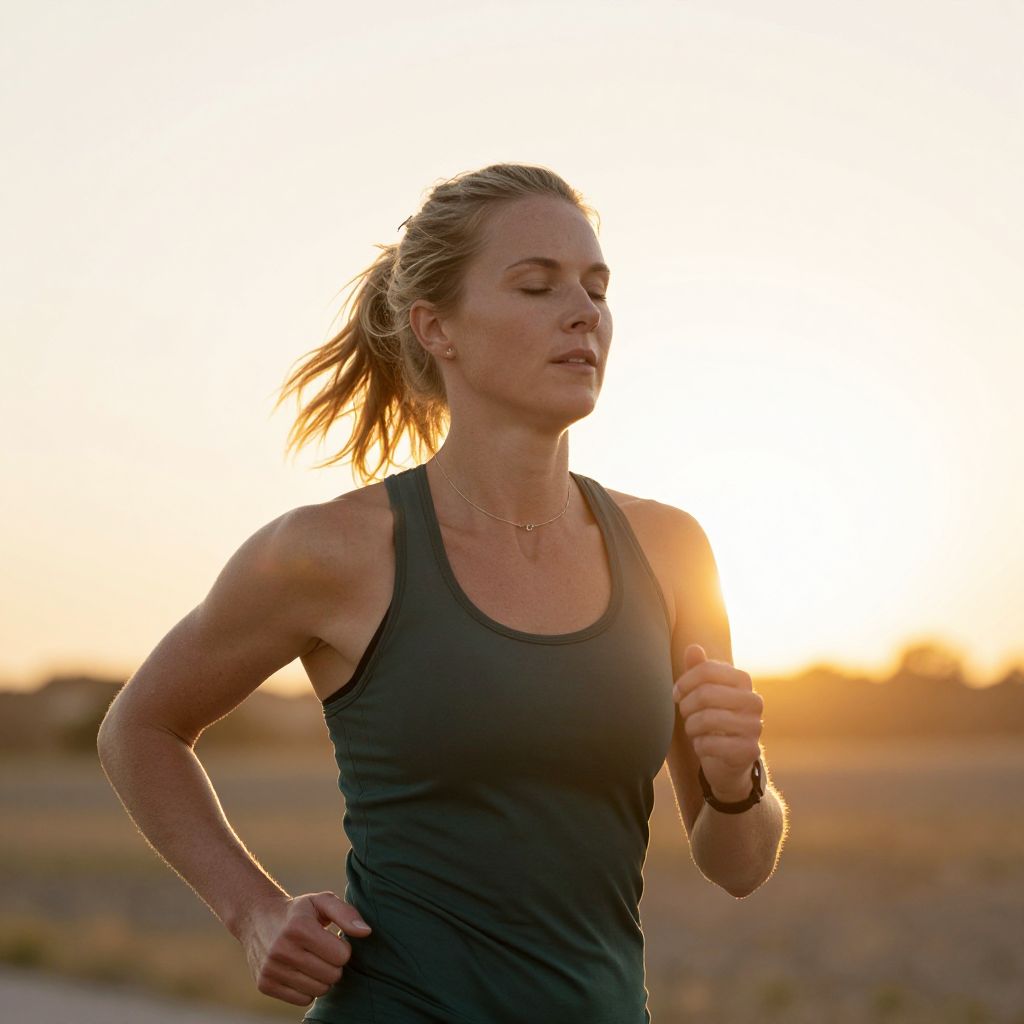 Photograph of a fit, blonde woman in a dark tank top running outdoors at sunset, with golden sunlight casting a warm glow.