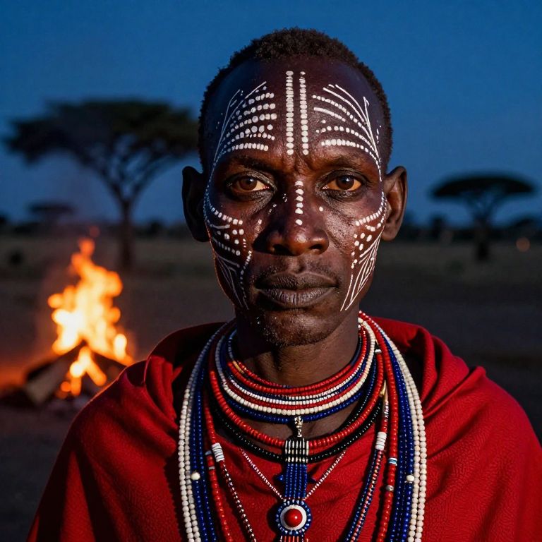 Photograph of a dark-skinned African man with short black hair, standing in a dimly lit savannah at dusk. His face is adorned with intricate white body paint featuring vertical and horizontal lines. He wears a red shirt and multiple layered necklaces with white and red beads. A bright, orange campfire is visible in the blurred background, along with silhouetted acacia trees against a deep blue twilight sky. The man's expression is serious and focused. The image highlights traditional African cultural practices and the natural beauty of the savannah landscape.