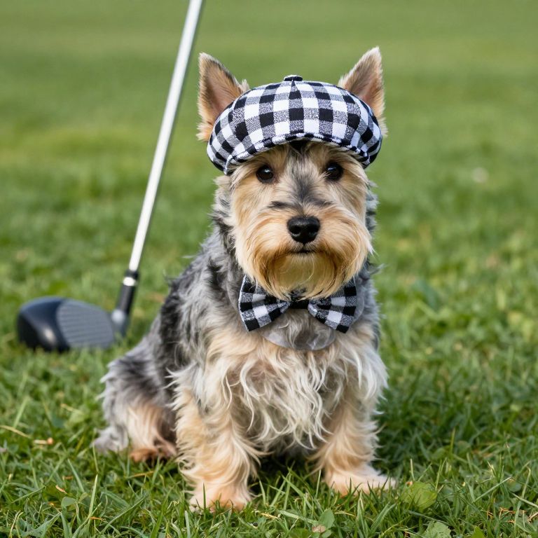 Photograph of a small Yorkshire Terrier with white and gray fur, wearing a black and white checkered flat cap and matching bow tie. The dog has a brown wooden pipe in its mouth and sits on a lush green grass lawn. A golf club is partially visible in the background to the left. The dog's fur is slightly wavy, and its eyes are dark and alert. The image is brightly lit with a shallow depth of field, making the dog the focal point against the blurred grassy background.