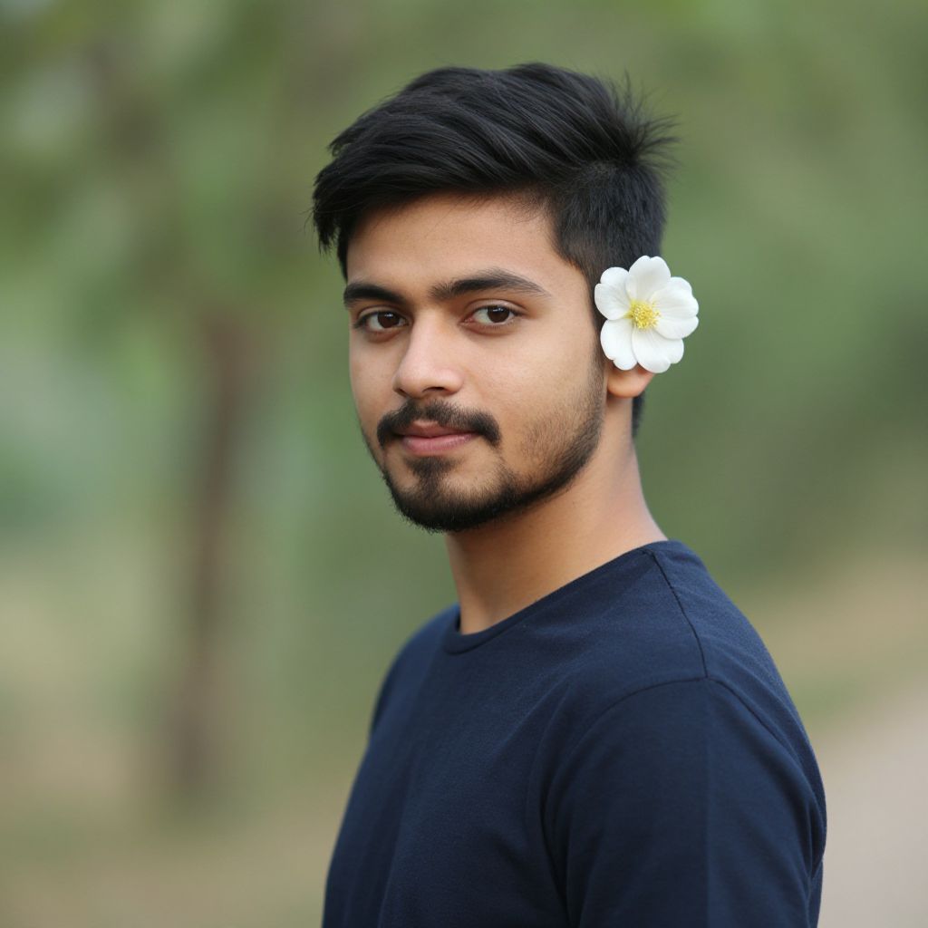 Photograph of a young South Asian man with short black hair, beard, mustache, wearing a black shirt, a white flower in his hair,