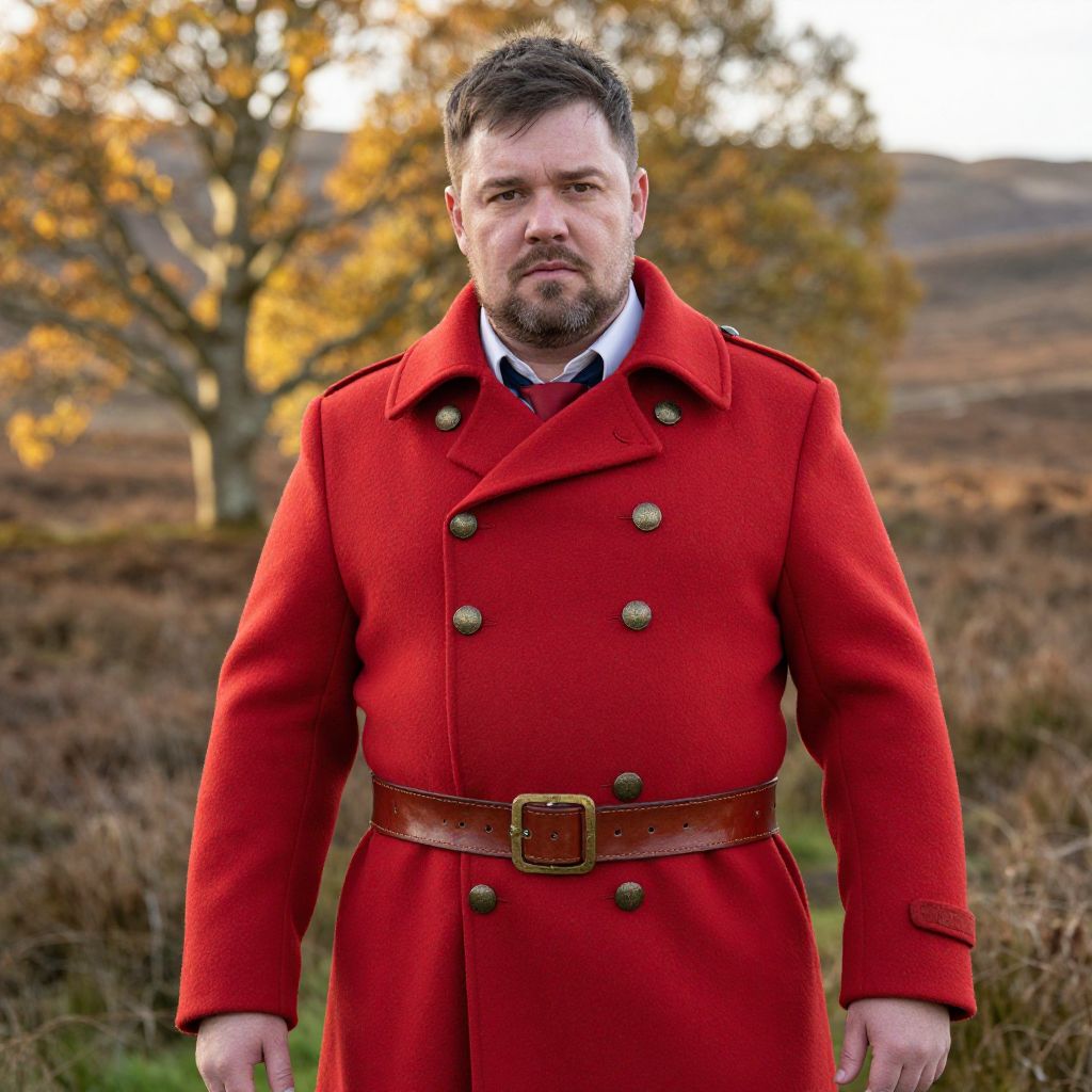 A lifelike, high-resolution image of a confident plus-size British man in his early 50s with a rugged face, short beard, and deep brown eyes, wearing a traditional British red coat with a polished leather belt and brass buttons, standing in a windswept moorland in Scotland during autumn, with golden sunlight filtering through the trees, realistic texture and fabric detail