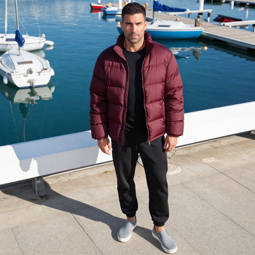 A man, burgundy puffer jacket, relaxed-fit black track pants, gray slip-on sneakers, sun-drenched docks, colorful sailboats bobbing, overhead shot, confident expression, vibrant atmosphere. Man has masculine face and piercing eyes