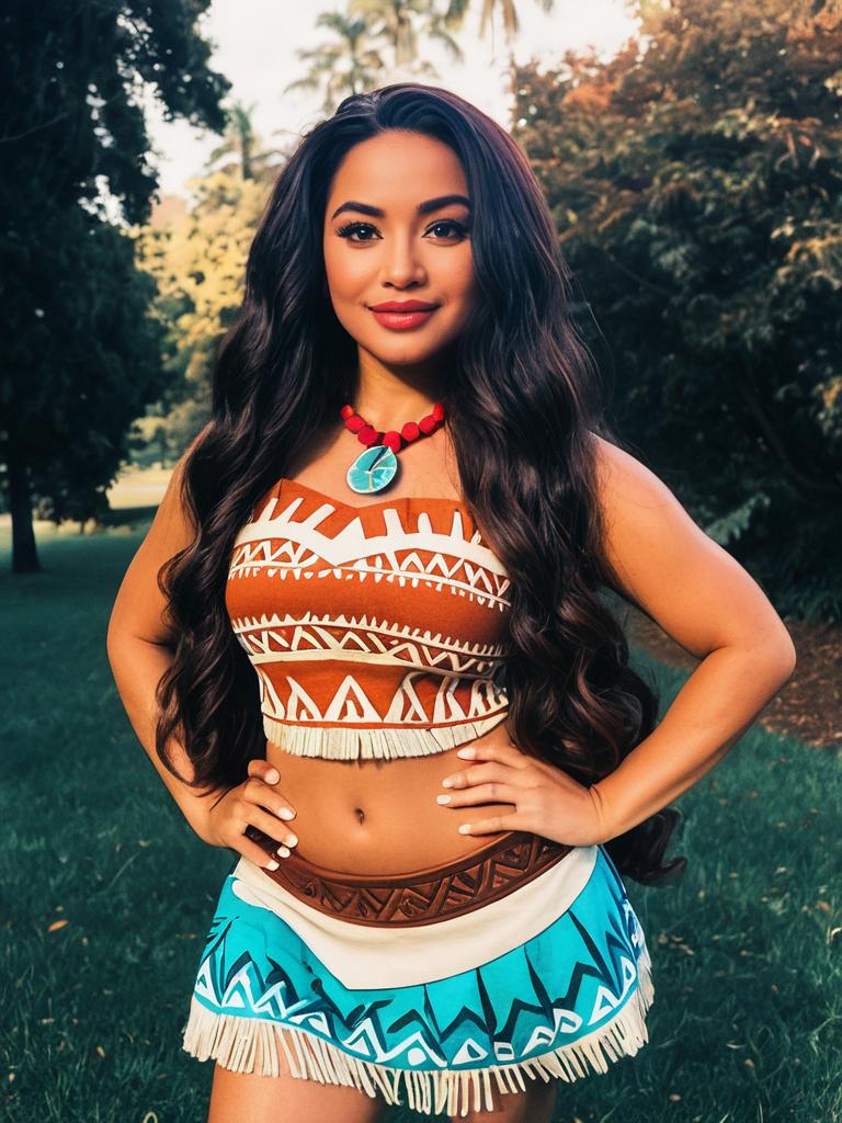 Woman cosplay. Wearing Moana (character) costume. Realistic photo. Dressed as Moana (character) --sref 1392