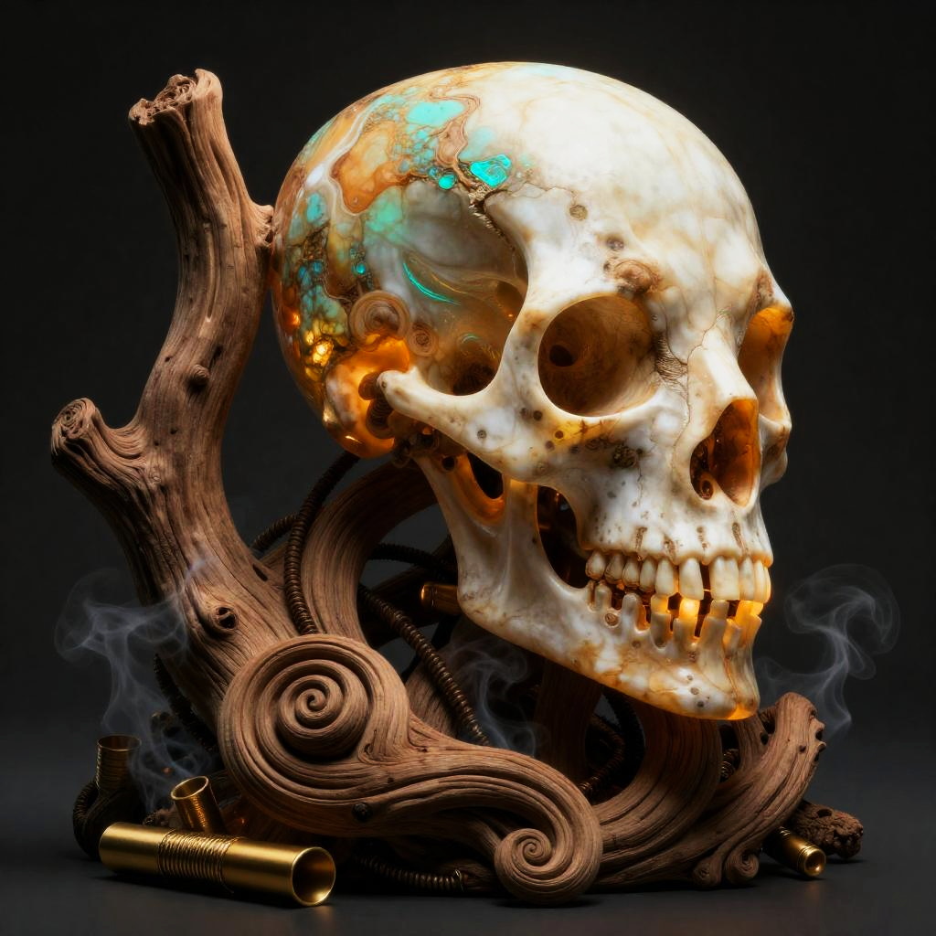 Nomadic Shaman made of luminescent carved bone and driftwood, wooden art nouveau swirls, strong subsurface scattering, smoke, tubes, gold elements, subsurface scattering, in the style of ruan jia and beeple and giger, subsurface scattering, ochre, turquoise patina, and bone white, back light, rim light, dramatic lighting, 8k, stunning scene, raytracing, octane render, trending on artstation