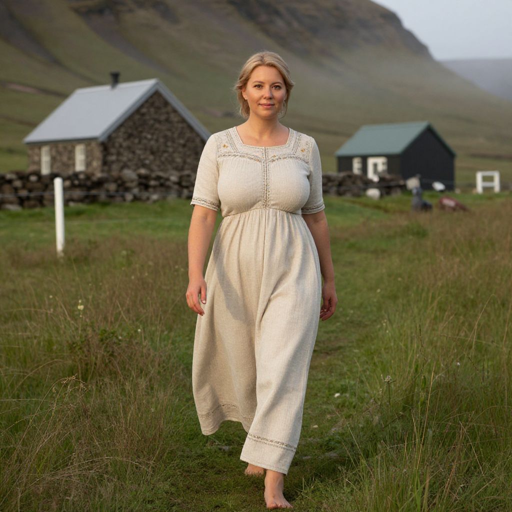 A serene woman with a warm, neutral face—light brown eyes, soft lips, and a natural, sun-kissed glow—wearing a flowing Icelandic wool dress with subtle embroidery in natural dyes, dressed in nordic simplicity; she is walking barefoot through a field of green grass near a stone cottage in a rural Icelandic village, with soft fog rolling across the hills.. The woman has big tits and cute face